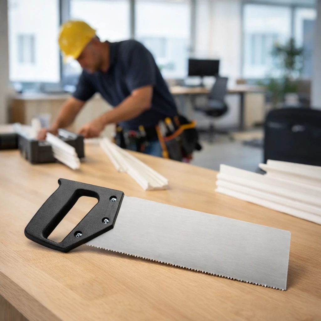 Sűrű fogazatú könnyű fém fűrész, polisztirol díszlécek méretre vágásához.